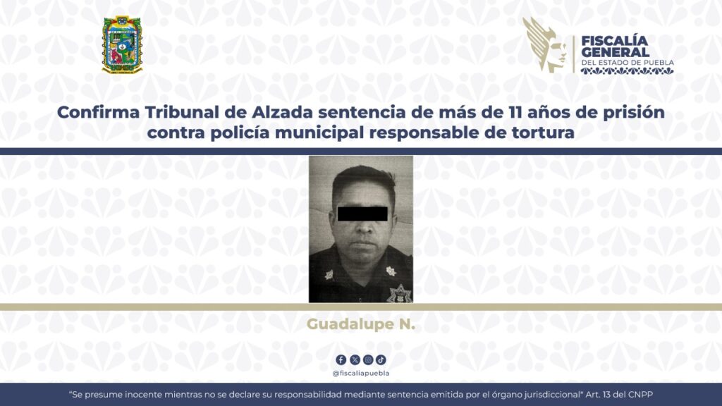 El Tribunal de Alzada confirmó la sentencia de primer grado con base a los argumentos vertidos por la Fiscalía General del Estado, contra Guadalupe N., elemento de la Policía Municipal de Puebla, quien deberá permanecer más de 11 años de prisión por su responsabilidad penal en el delito de tortura, en agravio de un ciudadano.