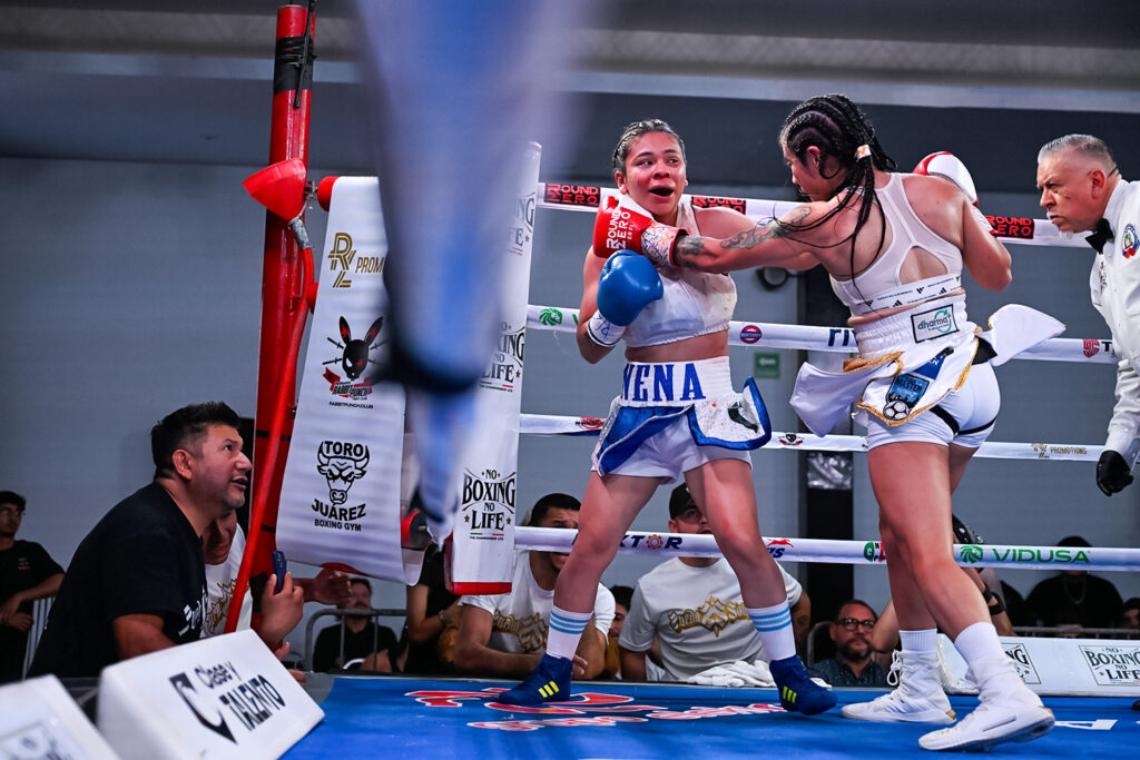 En el segundo asalto, la poblana intentó responder a los embates de la regiomontana, quien siguió con el dominio de la batalla conectando las mejores combinaciones de golpes principalmente con destino al mentón de su rival.