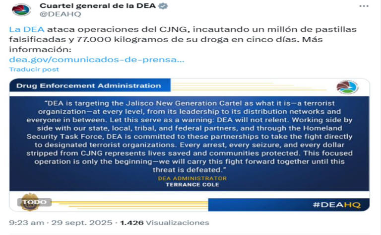 “Que esto sirva de advertencia: la DEA no cejará. Trabajando codo a codo con nuestros socios estatales, locales, tribales y federales, y a través del Grupo de Trabajo de Seguridad Nacional, la DEA se compromete con estas alianzas para combatir directamente a las organizaciones terroristas designadas. Cada arresto, cada incautación y cada dólar confiscado al CJNG representa vidas salvadas y comunidades protegidas. Esta operación enfocada es solo el comienzo; juntos continuaremos esta lucha hasta derrotar esta amenaza”, mencionó.