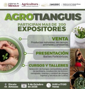 Amozoc de Mota, Puebla a 30 de septiembre de 2025 – El próximo domingo 5 de octubre de 2025, de 08:00 a 17:00 horas, se realizará el Primer Agrotianguis en la Explanada del Zócalo Municipal de Amozoc, en coordinación con la Secretaría de Agricultura y Desarrollo Rural del Gobierno Federal y el Ayuntamiento de Amozoc 2024-2027.