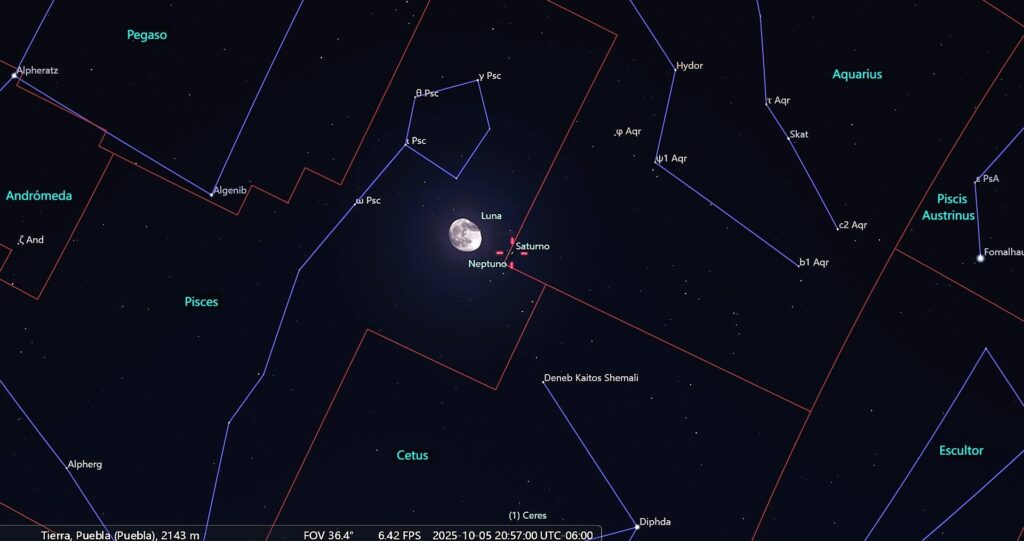 En esta ocasión, el 6 de octubre a las 2:57 horas de Tiempo Universal (octubre 5 a las 20:57 horas del centro de México), tendremos la conjunción de la Luna y Saturno, es decir, ambos cuerpos coincidirán en una de sus coordenadas celestes, la Ascensión Recta, y la Luna estará pasando a 3° 47’ al norte de Saturno. Nuestro satélite se encontrará en dirección de la constelación de Piscis, y Saturno en la constelación de Acuario. Para observar esta maravillosa postal, sólo tiene que levantar la vista al firmamento, no hace falta ningún instrumento óptico.