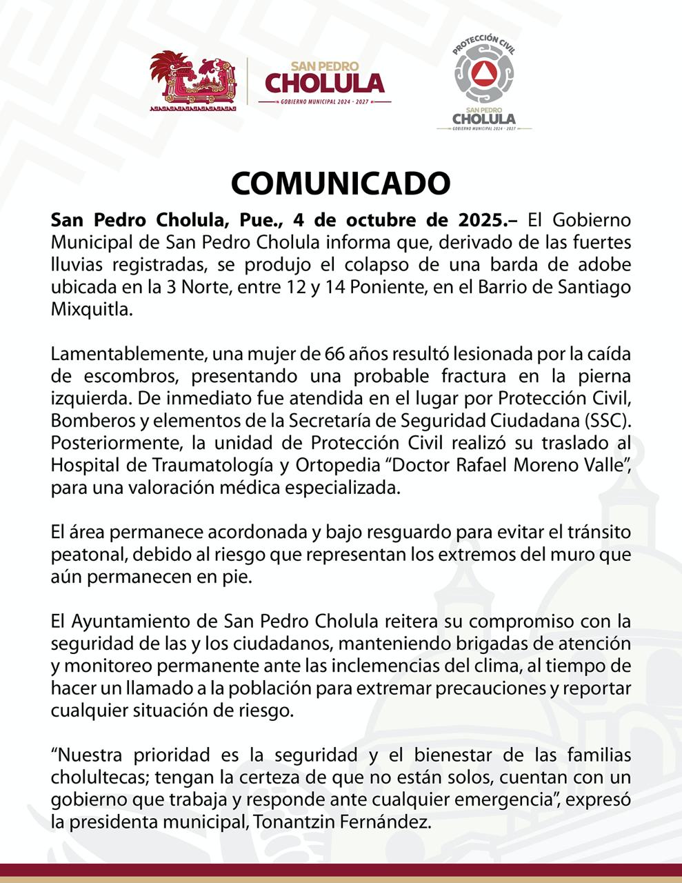 *4 de octubre de 2025. San Pedro Cholula, Pue. –* El Gobierno Municipal de San Pedro Cholula informa que, derivado de las fuertes lluvias registradas, se produjo el colapso de una barda de adobe ubicada en la 3 Norte, entre 12 y 14 Poniente, en el Barrio de Santiago Mixquitla.