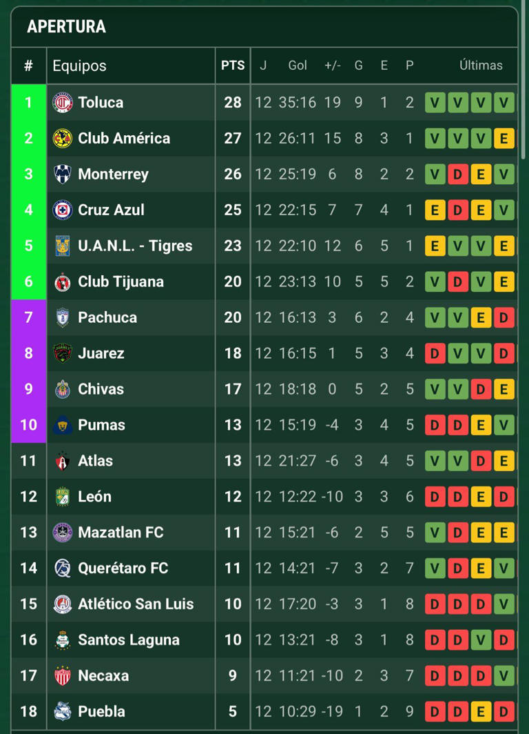 La jornada 12 del torneo Apertura 2025 de la Liga MX llegó a su fin y hubo varios movimientos en la tabla de posiciones, cada vez más cerca de llegar al fin de la temporada regular y se definan los boletos de clasificación directa y vía Play-In.