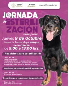 El Ayuntamiento de Atlixco, encabezado por la presidenta Ariadna Ayala, invita a participar en las Jornadas Gratuitas de Esterilización y Atención Médica Animal, que promueven la tenencia responsable y el bienestar de las mascotas.