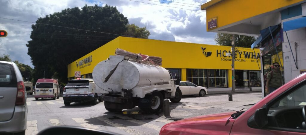 Una pipa de agua quedó atorada este sábado sobre la 11 Norte, luego de que el conductor intentara dar la vuelta y el vehículo se enganchara con unos tubos metálicos colocados sobre la acera.
