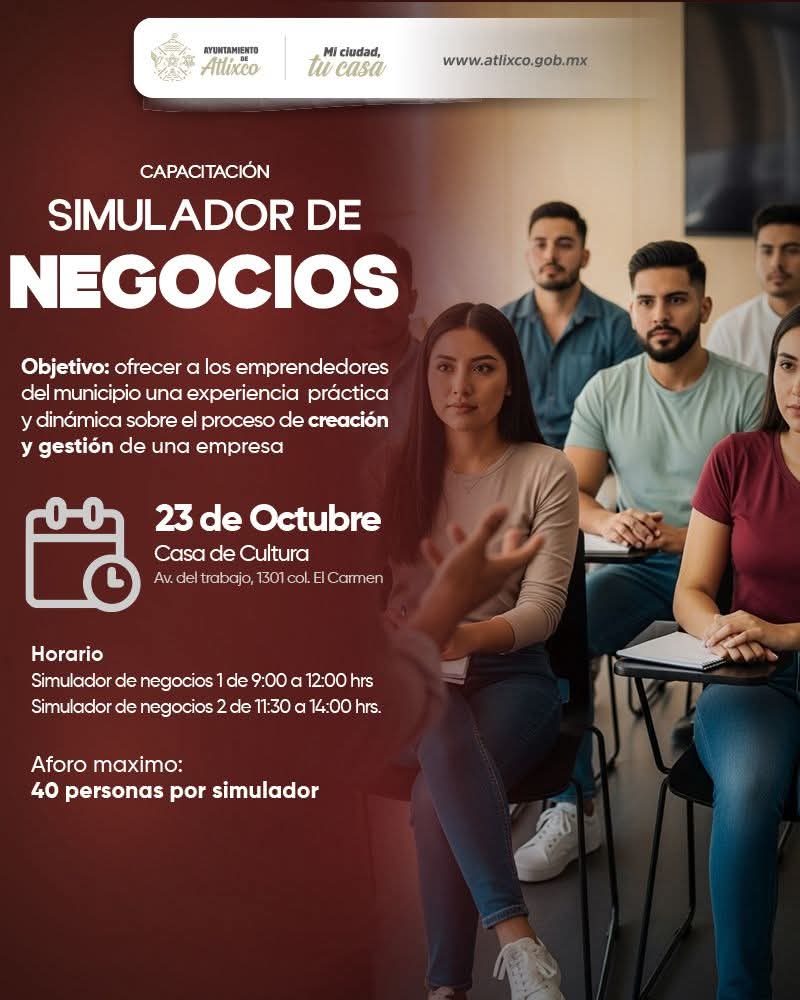 Con el propósito de impulsar el desarrollo económico y fortalecer las habilidades empresariales de los atlixquenses, el Ayuntamiento de Atlixco, encabezado por la presidenta Ariadna Ayala, a través de la Incubadora Municipal de Negocios y en coordinación con la Secretaría de Economía Federal Delegación Puebla, llevará a cabo la capacitación “Simulador de Negocios”.