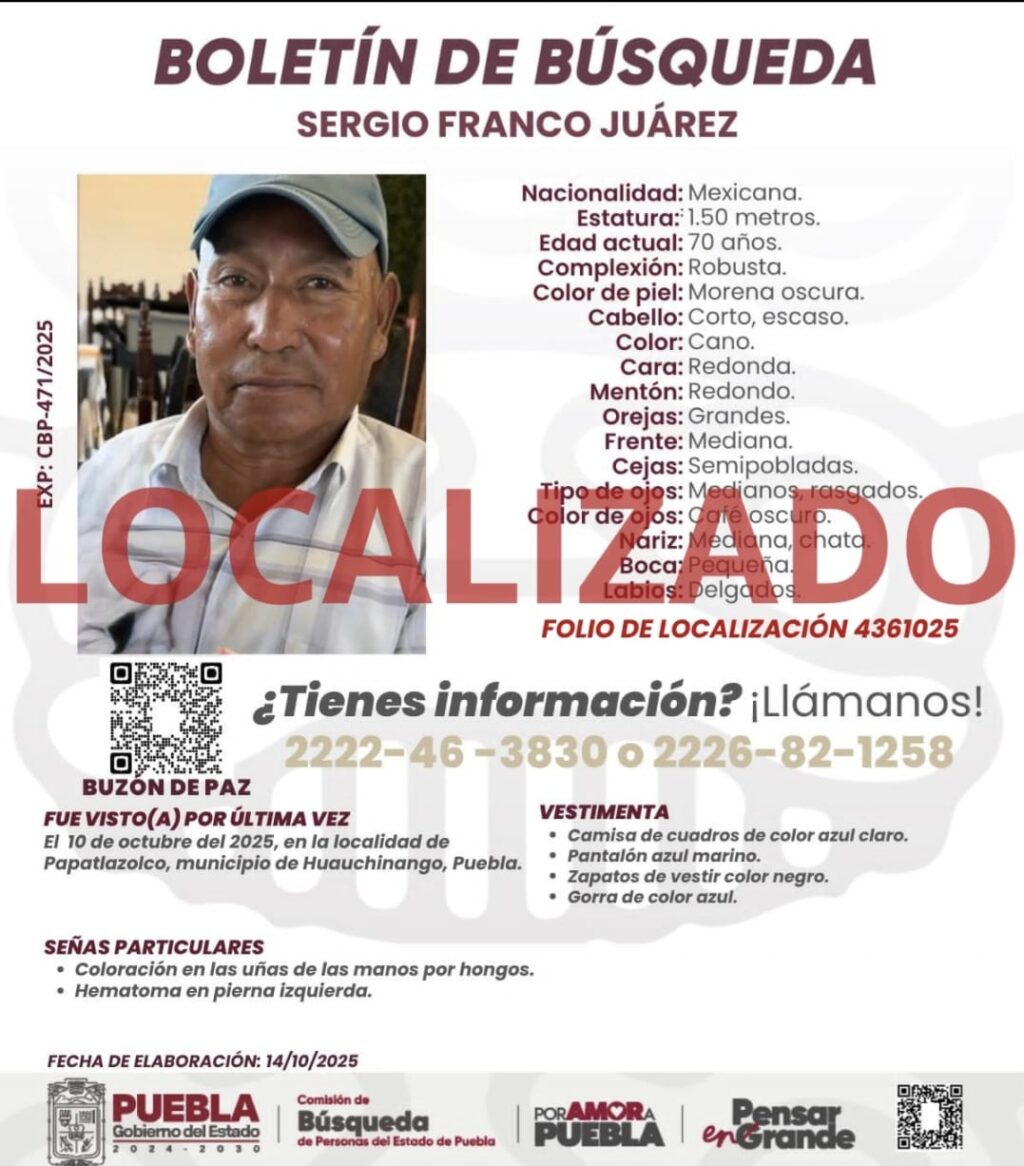 *CIUDAD DE PUEBLA, Pue.—* El Gobierno del Estado de Puebla, a través de la Secretaría de Gobernación y la Comisión de Búsqueda de Personas del Estado de Puebla, encabezada por Juan Enrique Rivera Reyes, informa la localización sin vida de Sergio Franco Juárez, originario de la localidad de Papatlazolco, municipio de Huauchinango, Puebla.