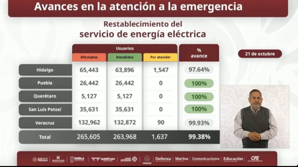 La Comisión Federal de Electricidad (CFE) logró el restablecimiento al 100% de la energía eléctrica en la Sierra Norte de Puebla afectada por las fuertes lluvias entre el 9 y 10 de octubre.