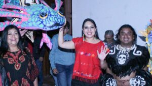 Durante el recorrido, la presidenta municipal visitó la ofrenda realizada con cartonería instalada en el Museo Casa del Caballero Águila, elaborada por estudiantes del Centro Cultural Iyolosiwa, con representaciones de animales mexicanos y seres mitológicos.