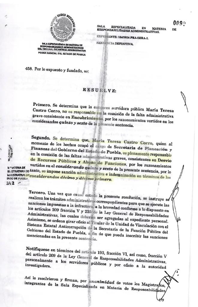 La Sala Especializada en Materia de Responsabilidades Administrativas del Poder Judicial del Estado de Puebla emitió el pasado 30 de septiembre un fallo ejemplar en contra de la ex secretaria de Finanzas, María Teresa Castro Corro, tras comprobarse su participación en el desvío de recursos públicos y el daño patrimonial ocasionado al colocar indebidamente 604 millones de pesos del Gobierno estatal en el Banco Accendo, institución financiera que quebró en 2021.