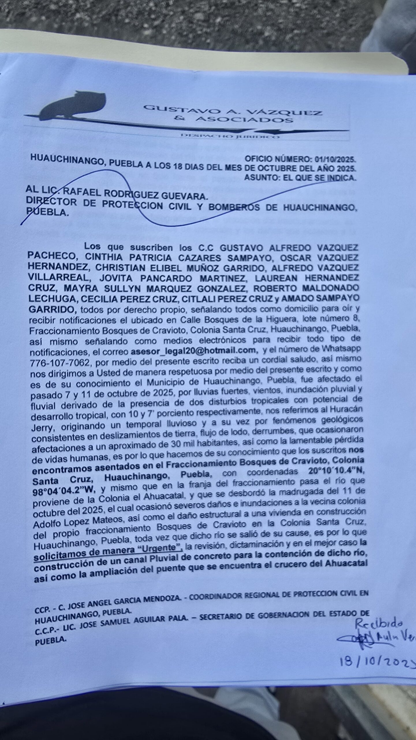 En un escrito dirigido al director de Protección Civil estatal, Bernabé López Santos, los vecinos expresan su urgencia por recibir apoyo y solicitan una revisión exhaustiva, para determinar las medidas preventivas necesarias y evitar posibles desastres. Es de esperarse y desearse que este funcionario sí atienda a la gente.
