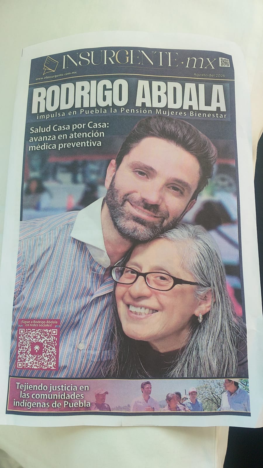 Pero no se le puede echar en cara que se mantenga estático, sino que –simplemente – tal vez anda en actividades mucho más redituables…ELECTORALMENTE HABLANDO, como lo demuestra que, en los días más difíciles de las lluvias e inundaciones, circuló en Puebla una publicación, “Insurgente mx”, con una enorme foto del funcionario FEDERAL y un cabezal muy revelador sobre su verdadero objetivo: “RODRIGO ABDALA impulsa en Puebla la Pensión Mujeres Bienestar”.