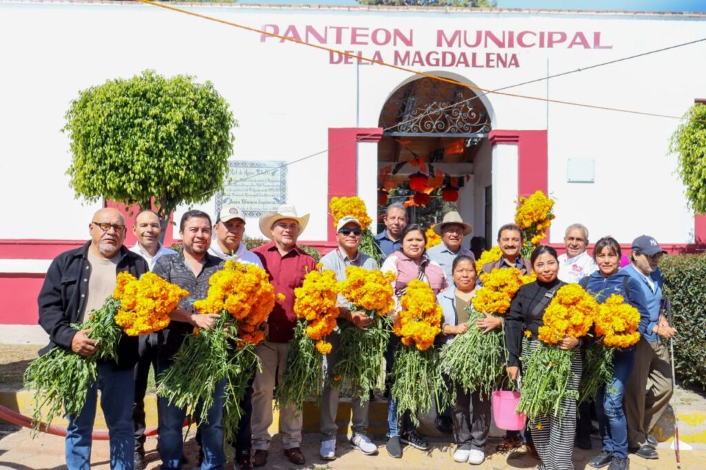 En el marco de las festividades de Día de Muertos, integrantes de la Secretaría de Bienestar y del Cuerpo de Regidores acudieron en representación de la presidenta municipal a los panteones de Jesús y La Magdalena, donde entregaron de manera gratuita ramos de flores de cempasúchil a las familias que visitaron a sus seres queridos.