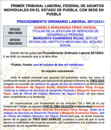 El trabajador promovió juicio laboral 297/2023 y que se encuentra en el Primer Tribunal Laboral Federal de Asuntos Individuales en el Estado de Puebla con sede en Puebla. En ese juicio laboral ya existe una sentencia de 07 de junio del 2024, donde esa autoridad condenó al IMSS: