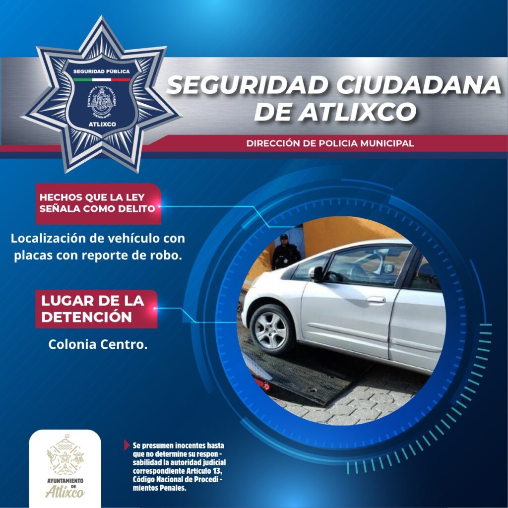 Elementos de la Secretaría de Seguridad Ciudadana de Atlixco aseguraron un vehículo cuyas placas presentaban reporte de robo, sobre la carretera federal Atlixco–Puebla.