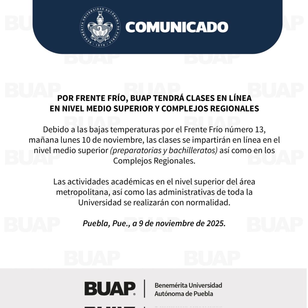 La Universidad Autónoma de Puebla emitió un comunicado, para informar que, debido al frente frío número 13, a partir de este lunes 10 de noviembre los estudiantes de nivel medio superior (preparatorias y bachilleratos) y complejos regionales tendrán clases en línea.