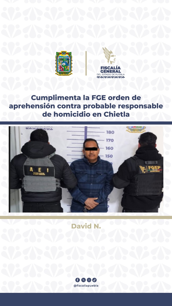 La Fiscalía General del Estado de Puebla detuvo a David N., en cumplimiento a una orden de aprehensión en su contra, por su probable participación en el delito de homicidio calificado, ocurrido en el municipio de Chietla.
