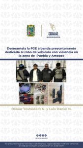 La Fiscalía General del Estado desarticuló mediante un operativo a una banda delictiva presuntamente dedicada al robo de vehículo con violencia en la zona limítrofe de los municipios de Puebla y Amozoc, operación en la que fueron asegurados Osmar Yoshudadt N. y Luis Daniel N. como probables integrantes.