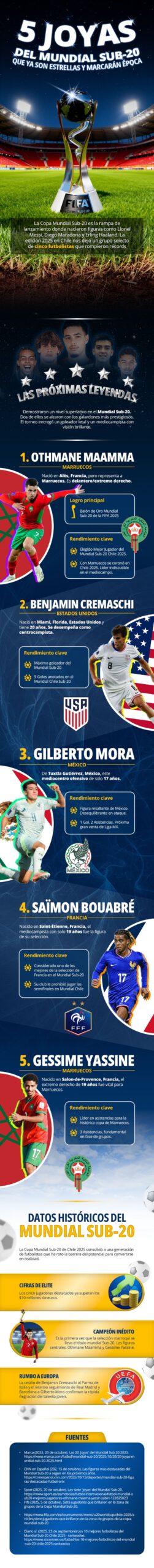 Esta información se basa en una infografía realizada por Marcadores 247, que recopila y destaca el desempeño de estas nuevas promesas durante el Mundial Sub-20, ofreciendo una mirada clara sobre los talentos que empiezan a ganar protagonismo en el panorama internacional.
