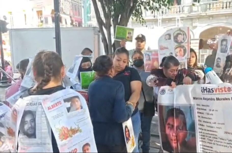 A la voz de “para nosotras ya no hay navidad, ni año nuevo”, integrantes del colectivo Voz de los Desaparecidos de Puebla realizaron un performance.