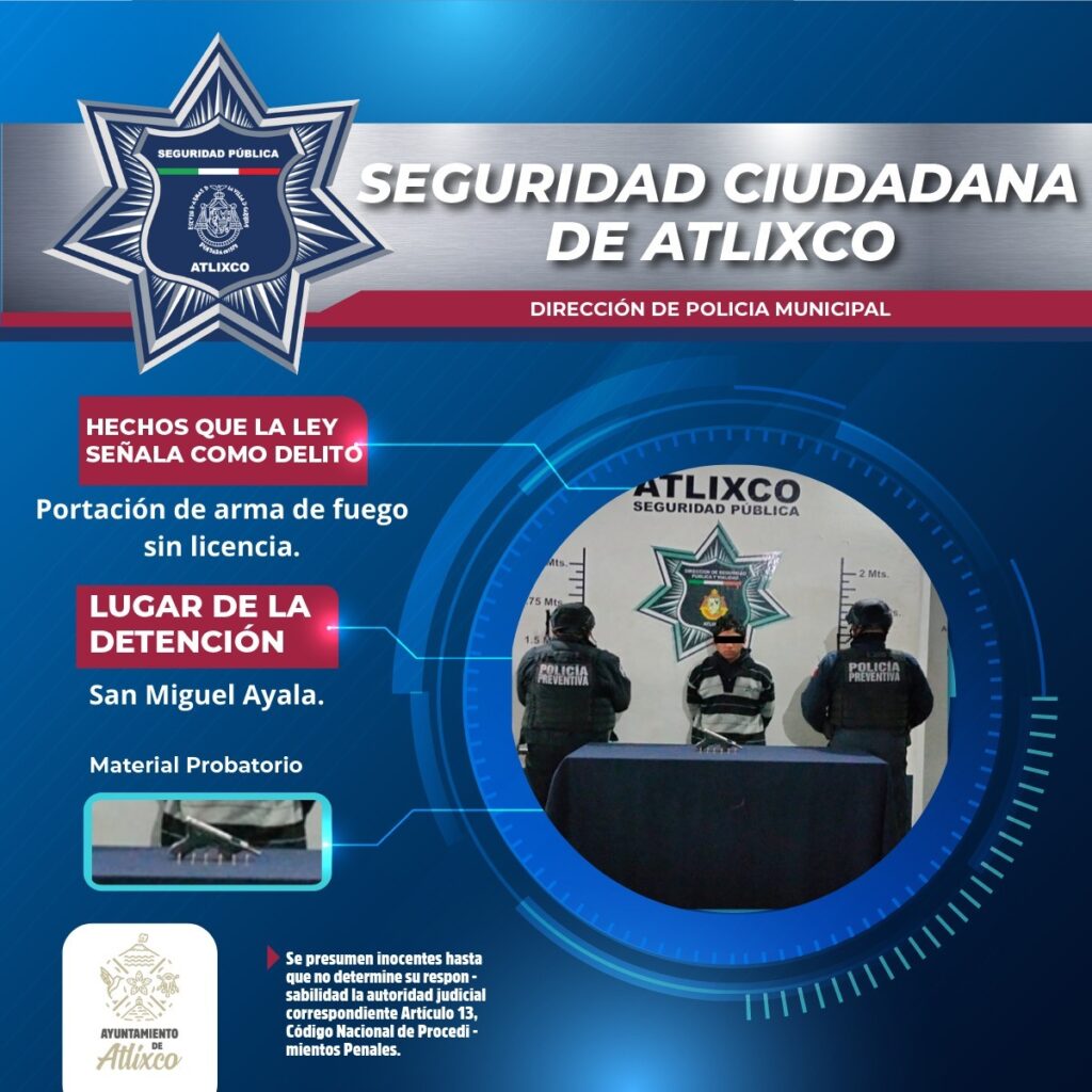Durante un operativo en San Miguel Ayala en Atlixco, policías municipales y estatales detuvieron en la madrugada a un joven que consumía bebidas alcohólicas en la vía pública y portaba un arma de fuego sin licencia.