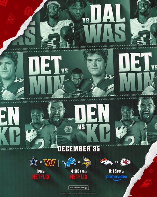 Los aficionados podrán disfrutar de las mejores acciones de los tres juegos de Navidad de la NFL 2025 desde la comodidad de su casa