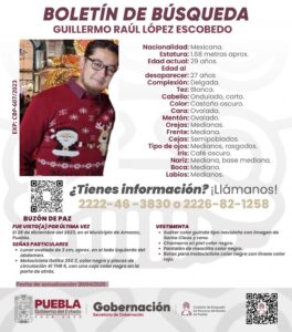 CIUDAD DE PUEBLA, Pue.- Ante el reporte por la desaparición y no localización de Guillermo Raúl López Escobedo, de 27 años, en diciembre del 2023 el Gobierno del estado a través de la Comisión de Búsqueda de Personas, mantiene acciones conjuntas entre autoridades estatales y familiares para su localización.