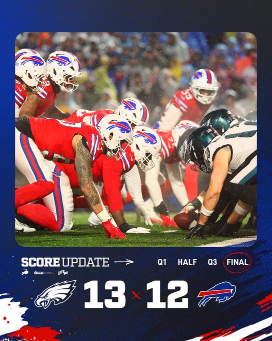 Pero los Bills cayeron ante los vigentes campeones del Super Bowl y fueron borrados prácticamente por tres cuartos, hasta la reacción en el último cuarto con 12 puntos. La remontada no fue posible al fallar las dos conversiones que derivaron en una apretada victoria de los Eagles, salvados por el gran trabajo de su defensiva que logró mantener a raya a Josh Allen, con todo y otra actuación irregular de su ofensiva. Buffalo reprobó un examen previo a los playoffs, en donde prácticamente no volverán a jugar de locales, por lo que el escenario puede complicarse.