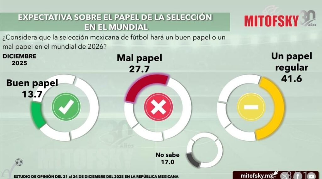 De acuerdo a la encuesta de Consulta Mitosky, el 13.7 por ciento de los mexicanos considera que la selección mexicana de fútbol hará un buen papel en el mundial y el 27.7 por ciento espera un mal desempeño.