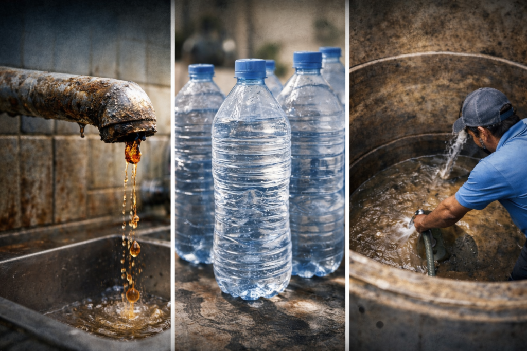 Las redes de distribución son el eslabón más débil del sistema. Fugas, rupturas y conexiones irregulares permiten que contaminantes externos entren en contacto con el agua. A esto se suma el mantenimiento deficiente de las cisternas y tinacos en los hogares, donde el líquido puede permanecer estancado durante días, expuesto a bacterias y partículas de óxido.