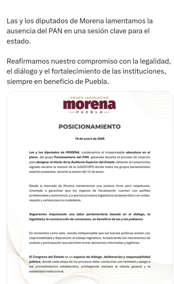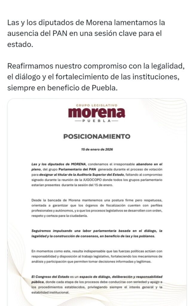 Política Slider Principal Morena fija posición ante abandono del PAN en la sesión legislativa By Redaccion1 / 15 enero, 2026 Diputados locales panistas votaron en comisión a favor del nuevo auditor superior y después abandonaron la sesión No estuvieron en las comparecencias de los secretarios de gobierno Desde Puebla You may also like ¡Conoce el calendario de Noche de Museos 2026! By Redaccion1 / 15 enero, 2026 Protección Civil alerta por el frente frío 28 By Redaccion1 / 15 enero, 2026 152 intentos de linchamiento el año pasado en Puebla: Aguilar Pala By Redaccion1 / 15 enero, 2026 Desalojan viviendas en El Carmen tras incendio en casa habitación By Redaccion1 / 15 enero, 2026 En breve, licitación para bachear: José Chedraui By Redaccion1 / 15 enero, 2026 Navegación de entradas Presidente de Amozoc participa en reunión estatal por la seguridad hídrica