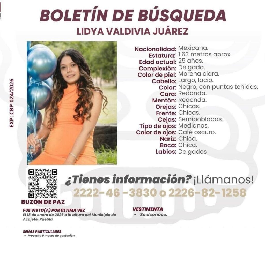 A través de redes sociales, solicitan ayuda para encontrar a Lidya Valdivia Juárez, quien salió de la ciudad de Puebla rumbo al municipio de Acajete–Apango, en un vehículo Chevrolet la madrugada del domingo 18 de enero.
