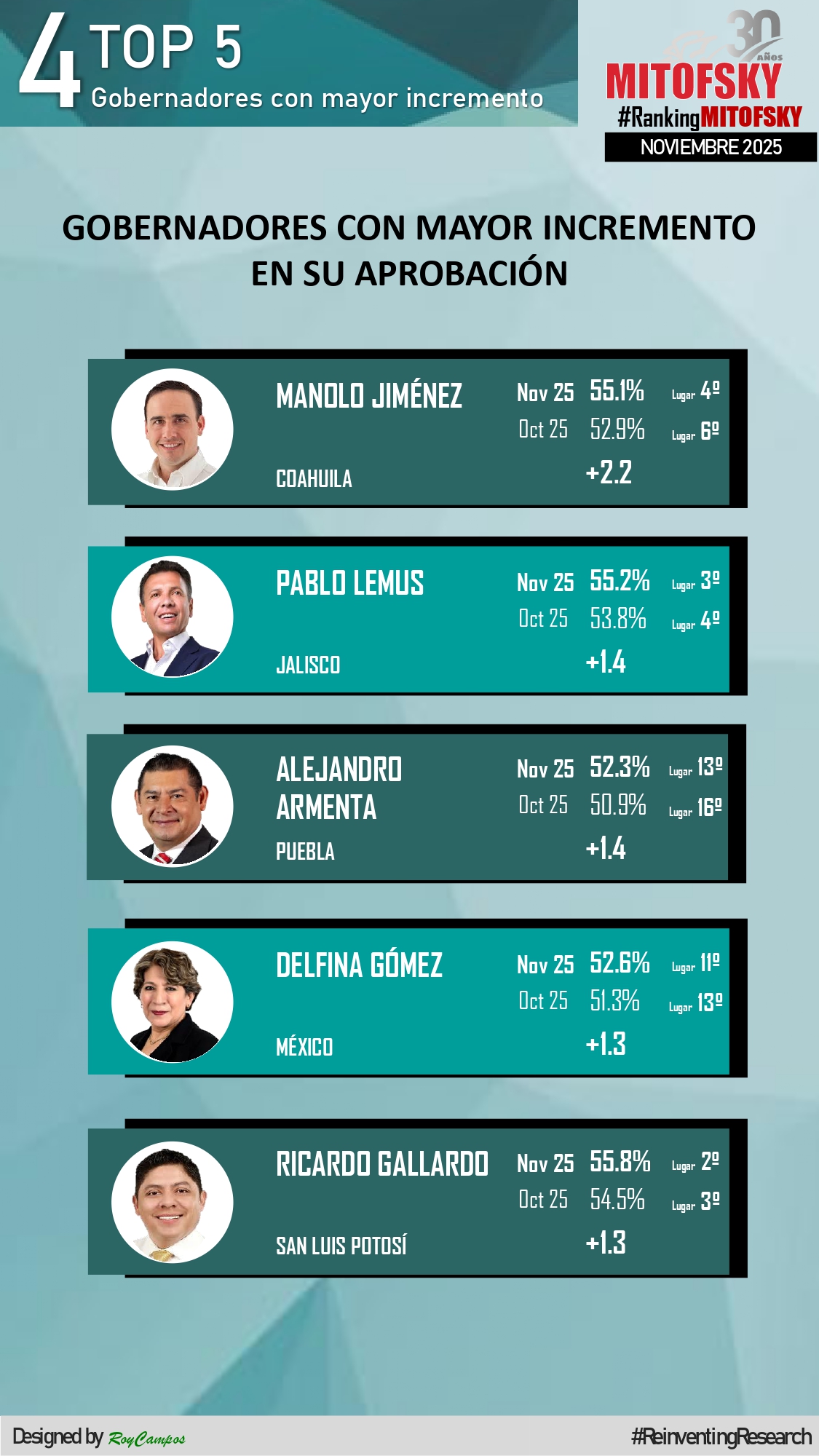 Sin embargo, “el estudio revela movimientos relevantes en la tendencia mensual. Coahuila registra el mayor incremento de aprobación con +2.2 puntos, seguido por Jalisco y Puebla con +1.4 puntos cada uno. San Luis Potosí y el Estado de México también muestran avances significativos”, detalla la empresa de Roy Campos en su página web.