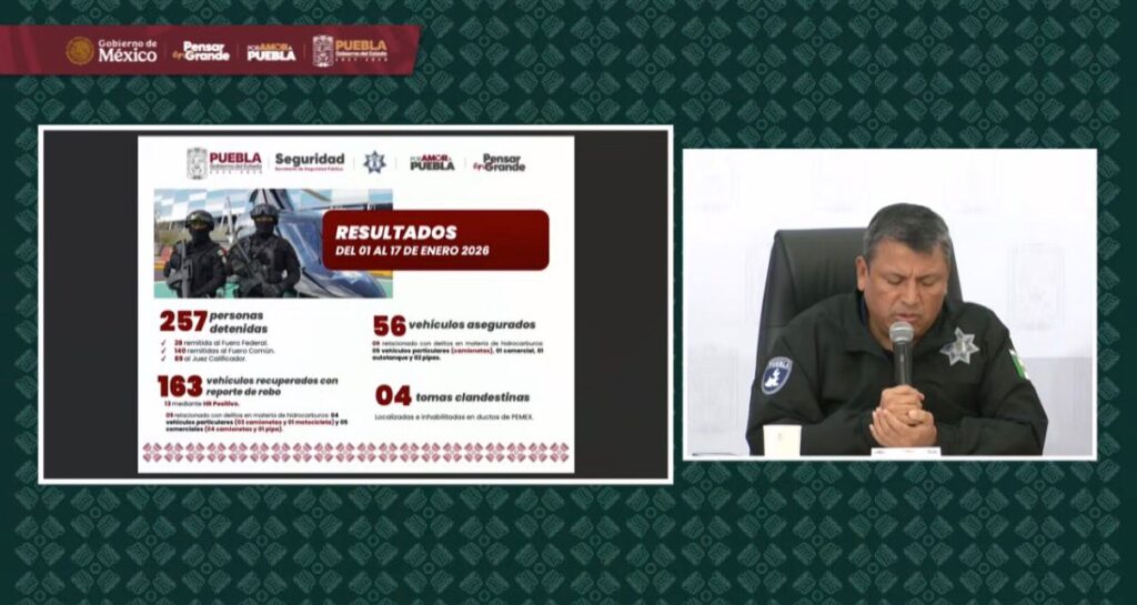 En los primeros 17 días del 2026, fueron detenidas en Puebla 257 personas por la comisión de diferentes delitos, reveló el vicealmirante y titular de la Secretaría de Seguridad Pública (SSP), Francisco Sánchez González.