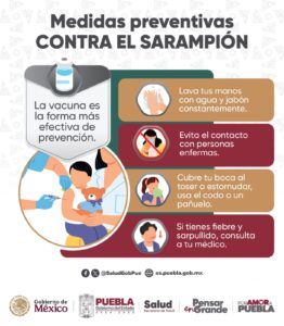 El sarampión es una enfermedad viral altamente contagiosa que se transmite por gotitas de saliva al toser o estornudar. Sus síntomas más frecuentes son fiebre, congestión nasal, ojos rojos, manchas dentro de la boca y una erupción en la piel que inicia en la cara y se extiende al resto del cuerpo.
