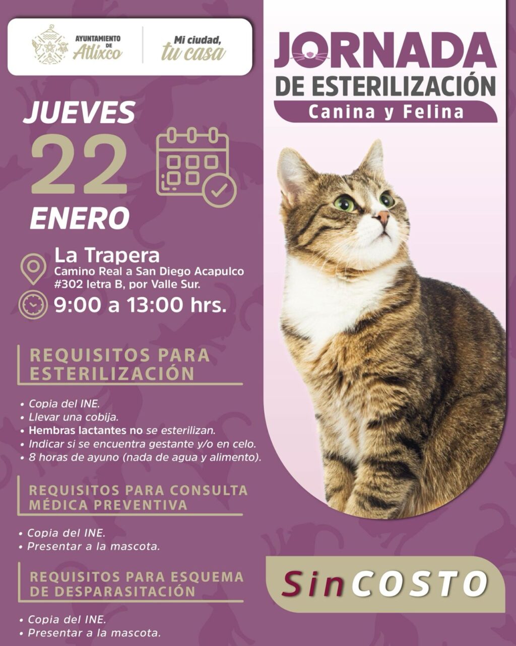 Durante estas jornadas se ofrecerán esterilizaciones caninas y felinas, consultas médicas preventivas y desparasitación, en un horario de 9:00 a 13:00 horas.