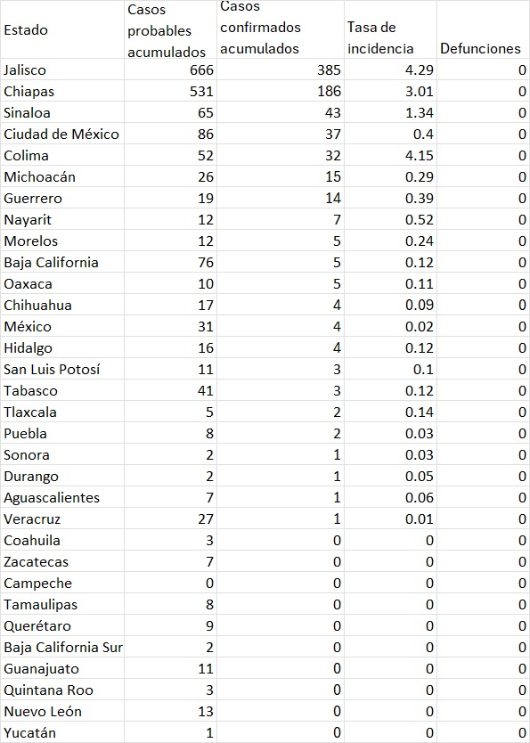 Jalisco encabeza la lista nacional con 385 casos confirmados acumulados, seguido de Chiapas, que reporta 186 casos. En un segundo nivel se ubican Sinaloa, con 43 casos confirmados, la Ciudad de México, con 37, y Colima, con 32 casos, conformando así los cinco estados con mayor número de registros confirmados de la enfermedad.