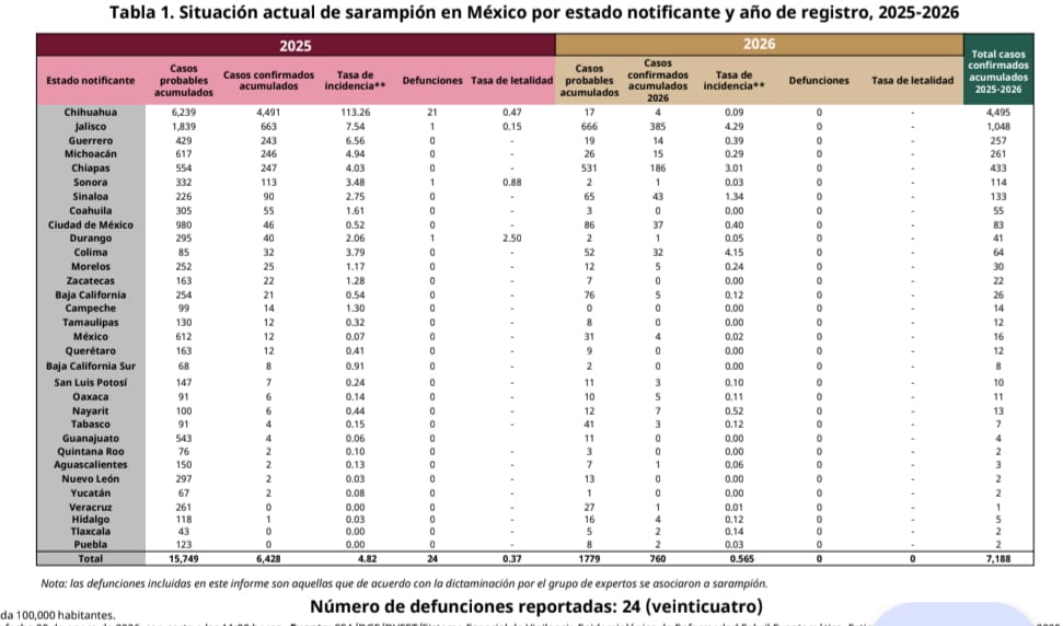 Las autoridades sanitarias mantienen la vigilancia epidemiológica activa y subrayan la necesidad de reforzar la vacunación y la detección oportuna, especialmente en las entidades con mayor número de casos confirmados.