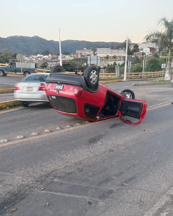 Un automóvil terminó volcado sobre la carretera federal México- Tuxpan a la altura del Parque Escénico en Huauchinango.