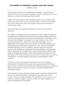 Según Obama, las explicaciones públicas ofrecidas sobre los tiroteos de Pretti y de Renee Good, asesinada días antes en calles cercanas al lugar de los hechos, no están respaldadas por investigaciones serias y, además, parecen estar directamente contradichas por pruebas en video.