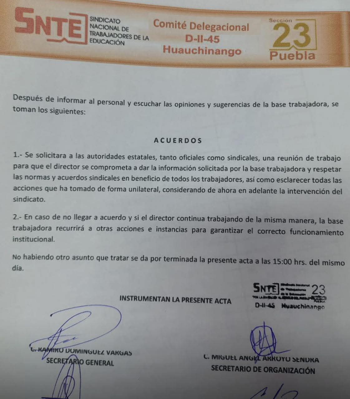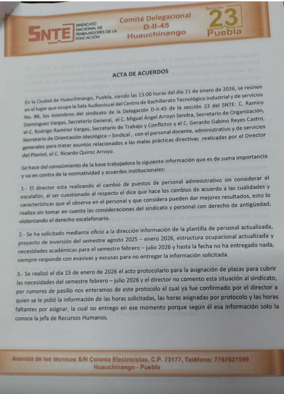 Integrantes de la delegación D-II-45 de la Sección 23 del SNTE documentaron en un acta formal diversas irregularidades que van desde cambios de personal sin respetar el escalafón y la antigüedad, hasta la negativa reiterada de transparentar información clave sobre asignación de plazas, horas docentes y estructura ocupacional.