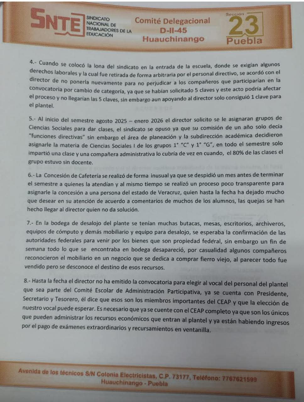 Para la base trabajadora, el patrón es claro: decisiones tomadas sin consulta, opacidad en el manejo de recursos y una administración que afirman parece priorizar intereses, económicos particulares por encima del bienestar académico.