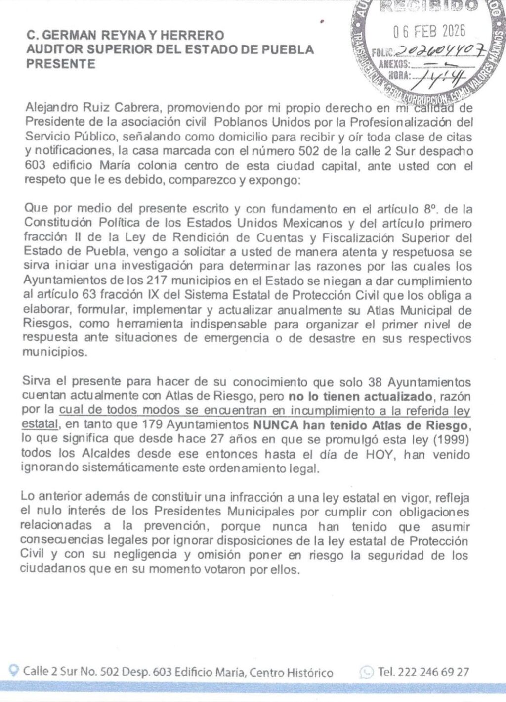 En este contexto, Poblanos Unidos hizo un llamado al Auditor Superior del Estado, Germán Reyna y Herrera, para que, en el marco de las auditorías que se realizan a los gobiernos municipales, se incluyan revisiones específicas sobre el cumplimiento de la Ley Estatal del Sistema de Protección Civil y se determinen las responsabilidades correspondientes.