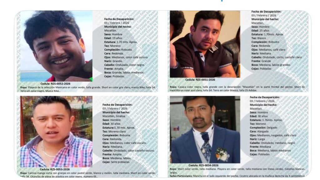 Toluca, Méx.- Continúa la búsqueda de los 4 jóvenes, Omar Alexis Ramiro Sabino, de 30 años; Óscar García Hernández, de 30; Javier Ramírez Sabino, de 25; y Gregorio Ramírez Sabino, de 19 años, 3 originarios del municipio de Ixtlahuaca y uno más de Jiquipilco, que fueron reportados como desaparecidos en cuando se encontraban de vacaciones en Mazatlán Sinaloa..