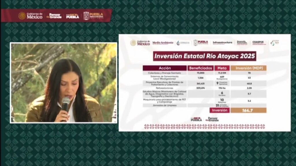 Durante el 2025, la inversión al río Atoyac alcanzó los 164.7 millones de pesos, imdicó la titular de la secretaría de Medio Ambiente, Rebeca Bañuelos.