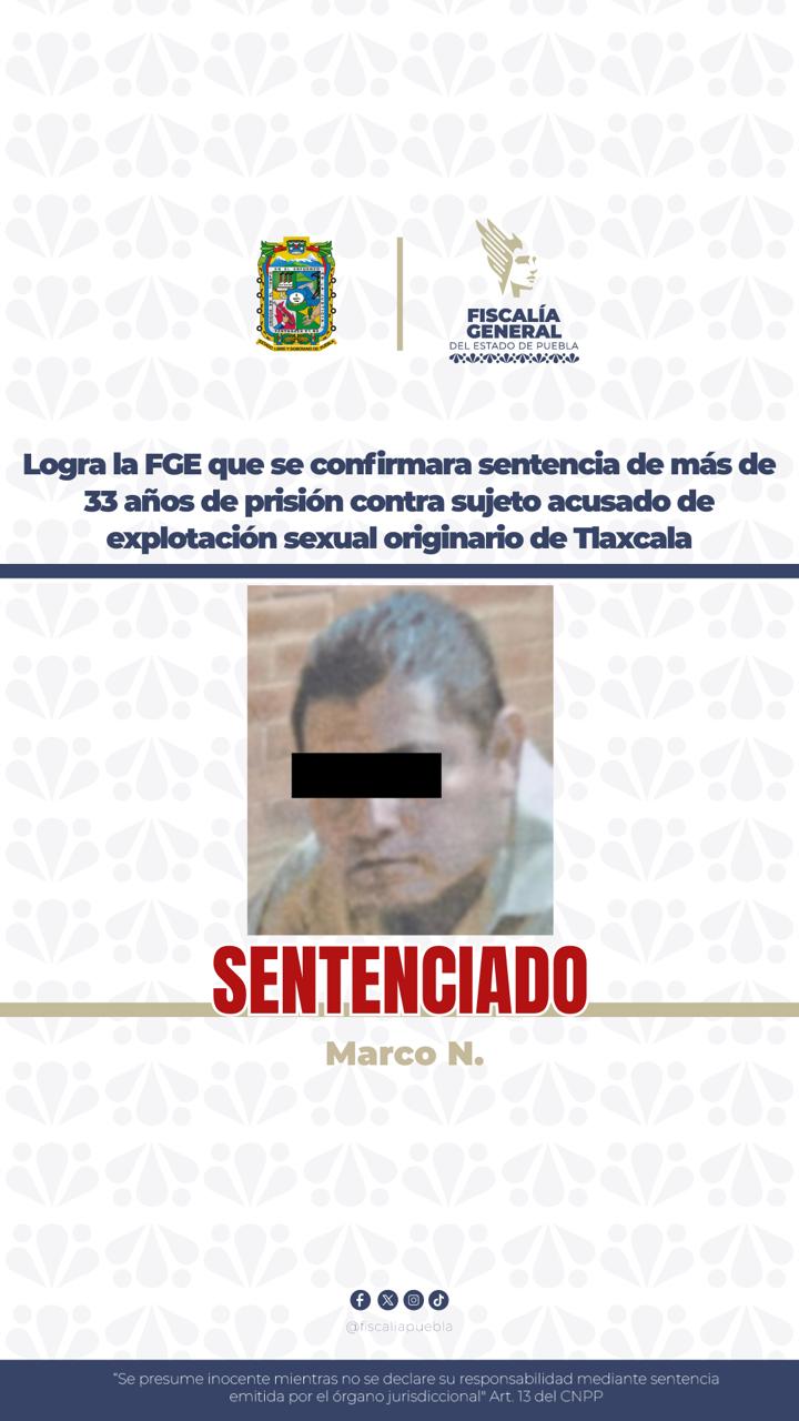 Con base en los argumentos presentados por la Fiscalía General del Estado, se logró que la autoridad judicial confirmara la sentencia de más de 33 años de prisión contra Marco N., originario del estado de Tlaxcala, acusado de trata de personas en su modalidad de explotación sexual por prostitución ajena.