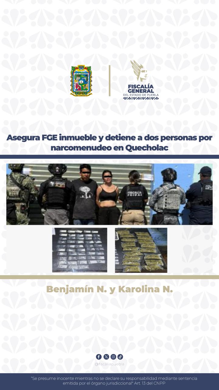 QUECHOLAC, Pue.- La Fiscalía General del Estado de Puebla (FGE), a través de labores de inteligencia e investigación de campo y gabinete, ejecutó un cateo en el municipio de Quecholac por delitos contra la salud, y logró el aseguramiento de un inmueble utilizado como punto de venta de droga y la detención de dos personas.