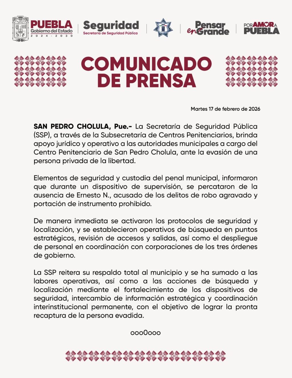 *17 de febrero, 2026. San Pedro Cholula, Pue.–* El Gobierno Municipal mantiene coordinación permanente con autoridades estatales y federales para fortalecer las acciones de búsqueda y proteger a la población, ante la evasión de una Persona Privada de la Libertad (PPL) registrada este lunes 16 de febrero en el Centro de Reinserción Social del municipio.