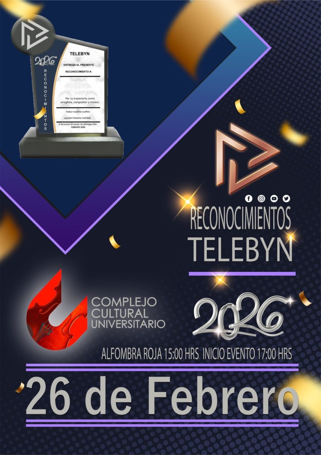 El próximo jueves 26 de febrero del presente año en el majestuoso escenario del Auditorio del Complejo Cultural Universitario de la BUAP se realizará la “4ª Entrega de Reconocimientos TELEBYN”.