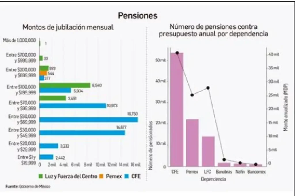 Raquel Buenrostro, titular de la Secretaría Anticorrupción y Buen Gobierno, expuso que la extinta Luz y Fuerza del Centro (LFC), Petróleos Mexicanos (Pemex), la Comisión Federal de Electricidad (CFE), Nacional Financiera (Nafin), Banobras y el Banco Nacional de Comercio Exterior (Bancomext) tienen en conjunto 94 mil 333 pensionados que reciben 96 mil 306 millones de pesos anuales, y de ellos 6 mil 297 perciben más de lo que gana la mandataria.